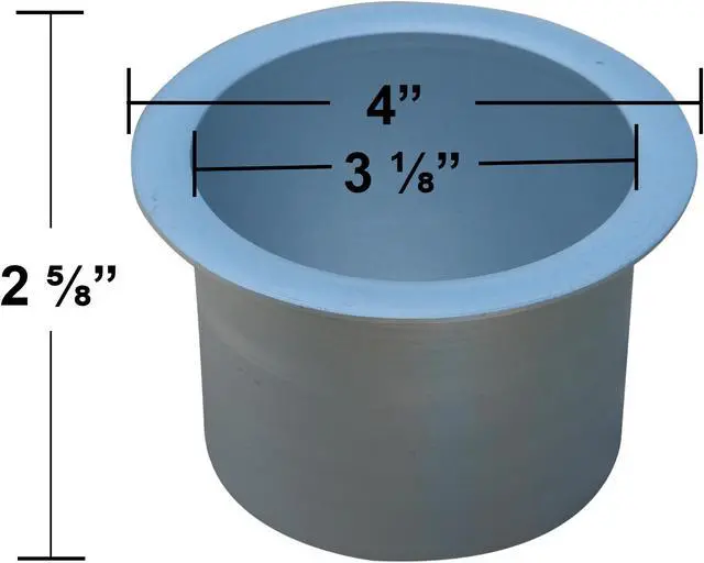 Universal replacement silver metal cup holder. This replacement cup holder measures 2 5/8 inches (65mm) tall. The inside diameter of the cup is 3 1/8 inches (80mm). The lip of the cup is 4 (100mm) inches in diameter. It will securely hold most cups, cans and 20 ounce bottles. Suitable for recliners, sofas, theater seating, tables (poker, blackjack and pool), RV's, boats, cars, trucks, and more. Contact customer service for additional information and bulk pricing.
