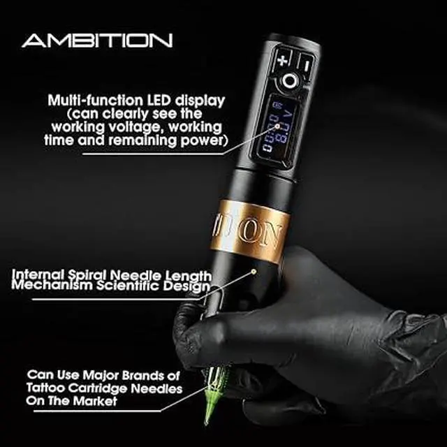 Package IncludedAmbition tattoo kit complete includes 1pc wireless tattoo pen machine. 1pc extra 4.0mm stroke cam accessory. 1pc silicone RCA cord. 1pc power cable. 1pc RCA adapter. 20pc tattoo cartridge needle(5X1203RL,5X1207RL,5X1207RM,5X1209RM). 1pc bandage. 10pc colors tattoo ink. 12pc ink cups. 2pair of gloves. 20pc pen bag. 1pc practice skin. 3pc transfer paper sheet. 5pc disposable table mat. 1pc zipper box. 1pc large suitcase.