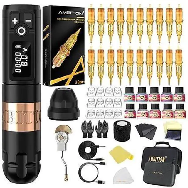 Package IncludedAmbition tattoo kit complete includes 1pc wireless tattoo pen machine. 1pc extra 4.0mm stroke cam accessory. 1pc silicone RCA cord. 1pc power cable. 1pc RCA adapter. 20pc tattoo cartridge needle(5X1203RL,5X1207RL,5X1207RM,5X1209RM). 1pc bandage. 10pc colors tattoo ink. 12pc ink cups. 2pair of gloves. 20pc pen bag. 1pc practice skin. 3pc transfer paper sheet. 5pc disposable table mat. 1pc zipper box. 1pc large suitcase.