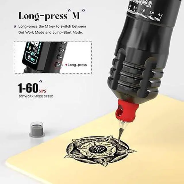 MULTI-USAGES: This versatile rotary tattoo machine is equipped with Memory Function, Dot Work Mode, and offers up to 8 hours of continuous use on a 4-hour charge. Perfect for both professional artists and beginners
