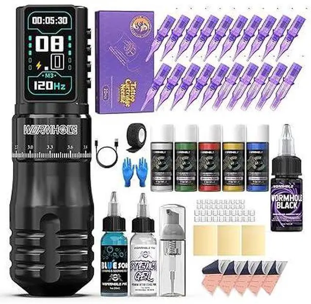 PACKAGE INCLUDE: Complete tattoo kit includes 1 adjustable tattoo pen, 1 Xtreme tattoo ink, 1 power supply, 20pcs tattoo needles, 3 tattoo practice skin, 5 tattoo stencil paper. Ideal for professional artist and beginners, this kit provides everything needed to start your tattoo journey