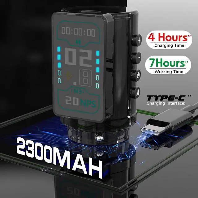 TATTOO GUN: Compact design of the tattoo gun makes it lightweight and portable. With a sleek black design and ergonomic grip, it ensures comfort and precision during detailed work. It includes a 2300mAh battery, supporting long hours of uninterrupted use