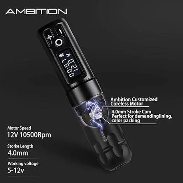 About Motor: Ambition rotary battery tattoo pen machine built-in custom coreless Motor, 10V - 9000RPM. More powerful, low skin loss, fast coloring, no hot for long time working.The pen machine is compatible with all cartridge needles types, direct drive system make tattoo machine get stronger and better for liner and shader.