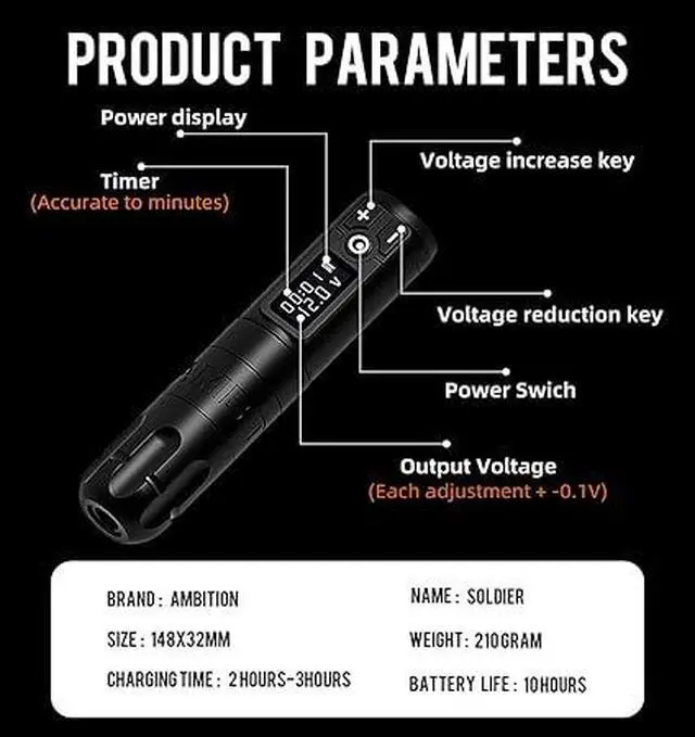 Material: Ambition rotary battery tattoo gun made of aluminium alloy frame and CNC carved. Length:148mm, Weight:210g. Detachable as a whole, easy to disassemble, maintain and replace spare parts.