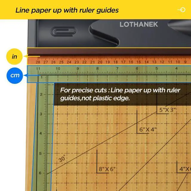 Features with line ruler guides, can meet your different needs. The alignment grid ensures precision, while the adjustable paper guide secures the paper in place for accurate cuts. The dual-scale ruler, marked in inches and centimeters, aids in measurement before cutting.