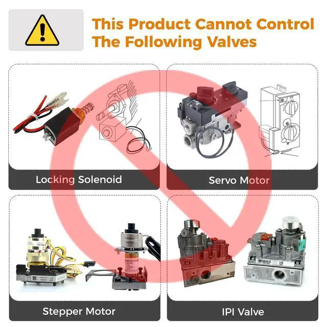 | Control Valve Type | Only control millivolt valves (including petroleum gas, natural gas, propane, etc.). Unable to control the locking solenoid valve, servo motor, and stepper motor. Confirm your valve type before purchasing. |