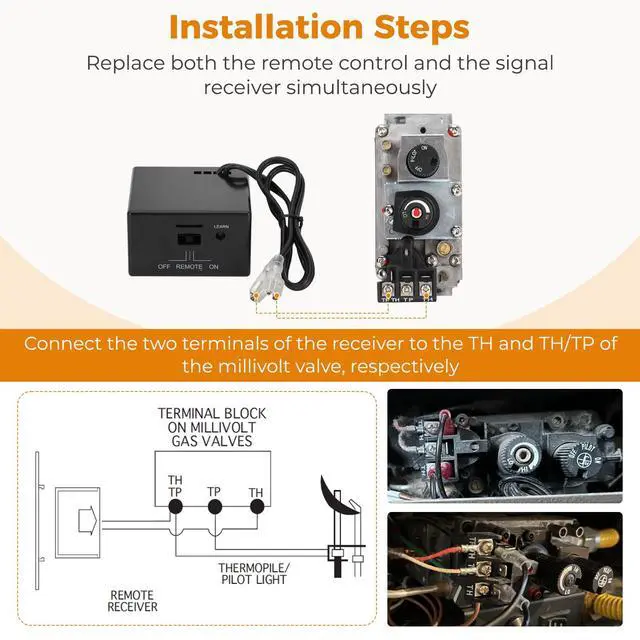 | Installation Steps | 1. Remove the old receiver. 2. Connect the wires from the new receiver to the valve's “TH” and “TH/TP” terminals. 3. Install new batteries. Slide the receiver's “Slide Switch” to both “ON” and “OFF” positions. Observe if the fireplace operates normally. If functioning correctly, press and hold the remote's ‘ON’ button. When the receiver emits a “beep-beep” sound, the remote and receiver are successfully paired and ready for use. 4. If pairing fails, proceed to Step 2 of “Troubleshooting”. |