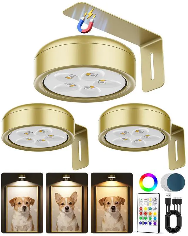 3 Pack Picture Lights for Wall,Wireless 2000mAh Rechargeable Magnetic LED Puck Lights with Remote,3 Color Temps and 12 RGB,Dimming & Timer,Art Frame Light for Painting Display,Photos,Wall Decor