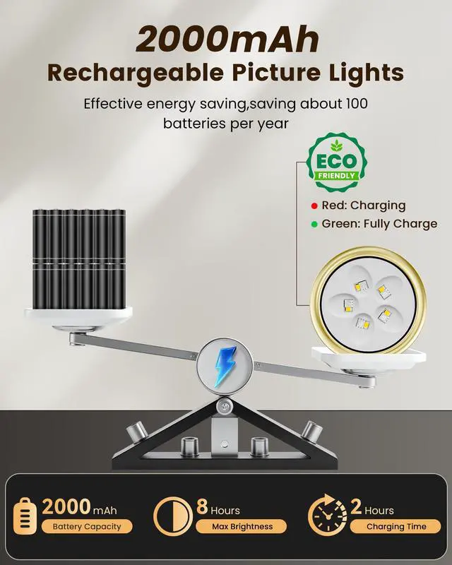 2000mAh Long-Lasting Rechargeable BatteryWireless picture light with built-in 2000mAh large-capacity battery, low power consumption and long lasting durability. Equipped with Type-C high-speed charging cable, fully charged in 2 hours