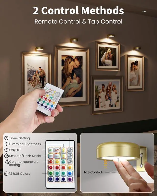 Remote Control Modes & Tap Easily control your painting lights for wall cordless with the included remote, or tap the lampshade to turn them on/off and adjust colors. Perfect for convenient and versatile lighting management