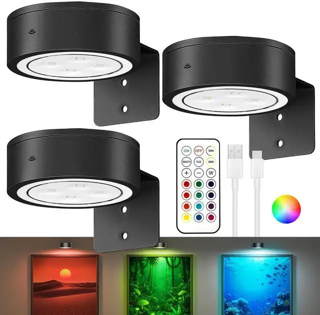 3Pack Picture Lights for Wall, RGB Color Changing Led Art Display Light with Rechargeable Battery Operated, Magnetic Painting Light with Remote Control, Wireless Home Wall Decorative Lighting, Black