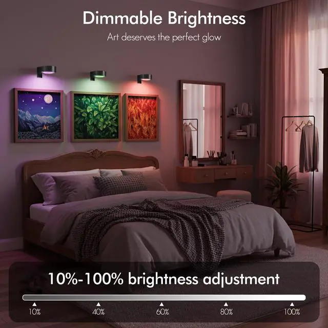 Versatility: Dimmable: 10-100% brightness adjustment. Timing function: set the picture light to turn off automatically after 30 or 60 minutes. Lighting effects can be set by remote control or manual touch