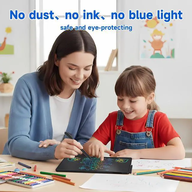 Eye-Protecting ScreenThe drawing board for kids adopts the newest colorful screen with pressure-sensitive technology which is no radiation no glare and protects eyes, provides vivid rainbow colors at the same time. Safe and comfortable even use for a long time.