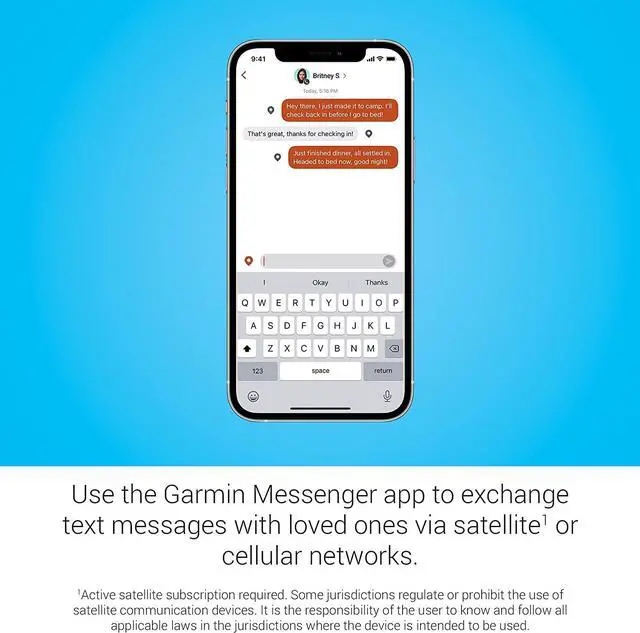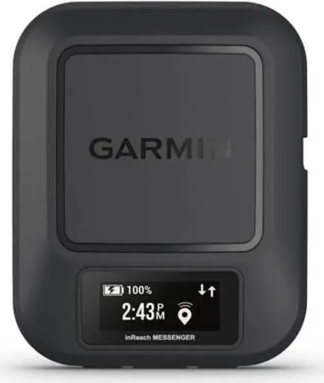 Share your location with loved ones back home anytime by using your MapShare page or with your GPS coordinates embedded in your messages. To access the global Iridium network and communicate with your inReach Messenger device, an active satellite subscription is required. You can opt for an annual package or a flexible month-to-month plan. Dont let the 3.1 inch x 2.5 inch size and 4 oz weight fool you. inReach Messenger is tough, durable, impact-resistant and water-rated to IPX7. Need a backup option in case your compatible smartphone battery dies? Just connect inReach Messenger to your phone for enough safety charge to send a custom text message from the inReach Messenger device via your phones touchscreen. The internal, rechargeable lithium battery gives you up to 28 days of battery life in 10-minute tracking mode, so you can do what you love longer between recharges. The Garmin Messenger app can sync with your compatible smartphones contacts list to make staying in touch even easier. The inReach Messenger devices high-end memory-in-pixel screen gives you the ability to confirm that messages have been sent, and you can even read responses right on the device.