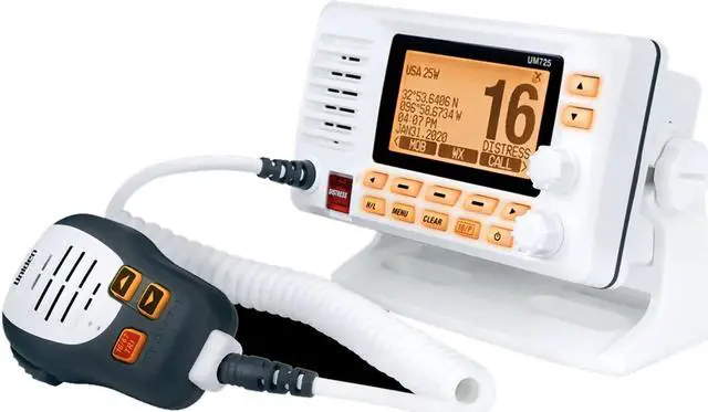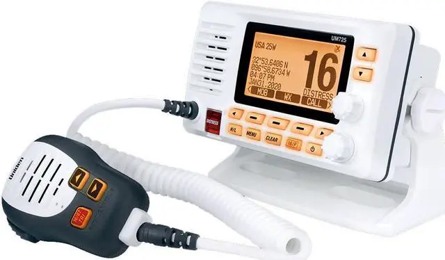 GPS and BluetoothModel: UM725GBTAll USA, Canadian, and International Marine ChannelsFull Class D DSC Compliant — Meets ITU-R 493-14, -15, IEC 62238Integrated GPS Receiver — WAAS, SBAS, QASS for accuracy1Watt / 25Watt Transmit Power — Transmits at full power to ensure maximum rangeLargest LCD size in class — 68mm (w) x 38mm (h) Private Text Messaging — Send messages over Marine VHF Channels to other equipped radiosNOAA Weather Channels — With Weather AlertsSpeaker Microphone Equipped — With UP, DOWN, PTT, 16/9/TRI keysRemote Microphone Capable — Optional Remote Microphone for second station operationNMEA0183 / NMEA2000 Input and Output — Send and receive GPS, DSC information to other devicesIPX8 Rated Waterproof — Submersible to 4.9 ft. for 30min with no water intrusionBluetooth Wireless — Connect to Smart Phone to Text Message using VHF FrequenciesThe UM725GBT is the first marine radio to offer Bluetooth wireless text messaging using your smart phone to text with a similarly capable marine VHF radio. You and your crew will enjoy the privacy of texting boat-to-boat, rather than broadcasting over your radio for all the boats in your area to hear.