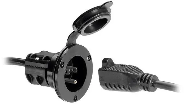 Bulk Packed Model: 1865111 Allows quick connection to AC extension cord Uses male AC plug from charger - no cutting/splicing wires Watertight cover and gasket protects AC plug against corrosion when not in use This convenient adapter allows quick thru-hull connections to an AC extension cord — with no cutting or splicing required — using the male AC plug from any of our chargers. The watertight cover and gasket prevent corrosion on the AC plug when it isn’ t in use.
