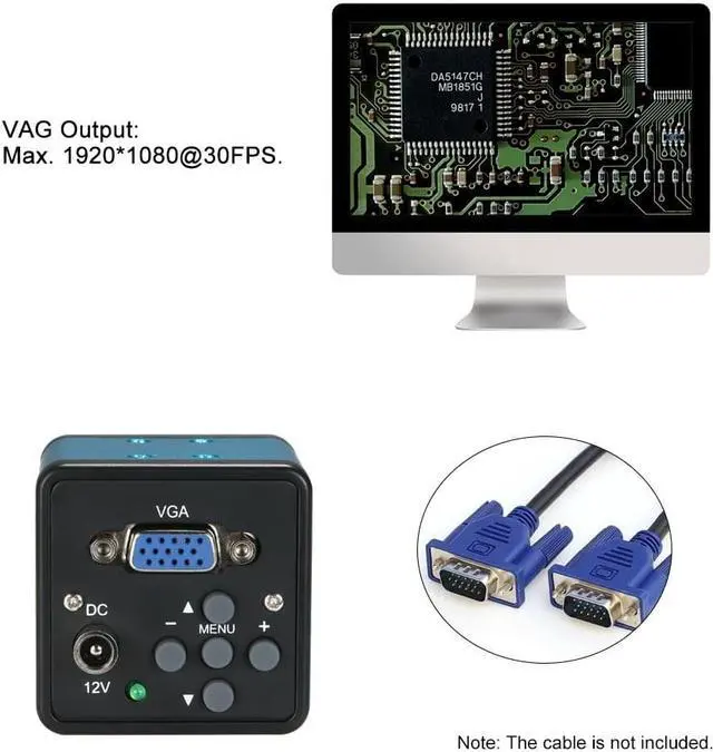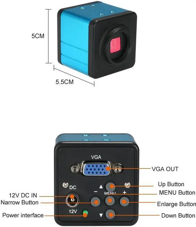 Specifications: Video Interface: VGA Sensor: 1/2.7" CMOS sensor VAG Output: Max. 1920*1080@30FPS Output of Display Resolution: 1920*1080/1600*1200/1440*900/1366*768/ 1280*1024/1280*720/1024*768/800*600 Pixel Size: 3.0um*3.0um Lens Interface: C/CS White Balance: Auto/manual S/N radio: 45dB Negative: Support Freeze: Support Mirror Flip: Left/Right, Up/Down Line: different color, 8 horizontal line , 8 vertical line, any positions OSD: English/Chinese Working Voltage: 12V Working Current: 150mA Camera Size: Approx. 5.5*5*5cm Camera Weight: Approx. 126g Package Information: Package Size: Approx. 13.5 * 9.5 * 5.8cm / 5.3 * 3.7 * 2.3in Package Weight: Approx. 248g / 8.7oz Features: *Supply VAG output port. High resolution, clear images. *VAG Output: Max. 1920*1080@30FPS. *With 1/2.7" CMOS sensor, the viewing angle is much wider than 1/3". *It builds in digital crosshairs and color control. *Industry 2.0MP CMOS camera. It can show the live image directly on any VAG monitor, projector or TV.