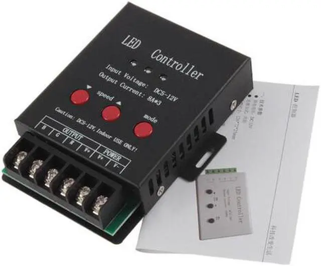 Technical parameters:Supply voltage: DC 5-12VInput voltage: DC 5-12VConnection mode: common anodeDimensions: 126 * 72 * 25mmWeight: 220gOutput current: <10A / RdOutput power: 360W (12V Features:1, RGB full color and light of the controller module;2, control: key control;3, display modes: 22 kinds of changes in effect can be arbitrarily selected, see patterns, etc.;4, the dynamic speed adjustable;5, and controller functions, power failure memory function;6, RGB three signals (a total of cathode, anode optional)