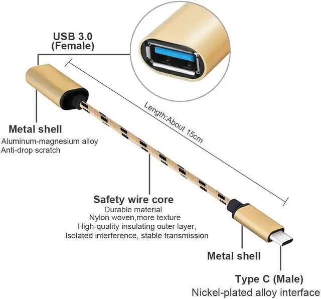 Please Note:1. Please make sure your mobile phone or tablet support OTG function before your purchase.2. This OTG adapter is designed for transferring data, we do not recommend using for charging.Specifications:Type: Aluminum Alloy OTG Adapter CableSize: about 18cmNet Weight: about 15.4g Features:EXPAND ANDROID PHONE TO CONNECT MORE- STONEGO OTG cable allows you to connect Android smart device with OTG(on the go) function to USB A peripheral like USB3.0/USB2.0 flash drives, pen drives, keyboard, game controller, wireless mice or even some SD TF card reader and more.CREATE MORE CONNECTION FOR LAPTOP- This OTG Adapter adds standard USB A female port for your USB C laptop to connect accessories like keyboard, mouse, USB hard drive, HDD, USB camera or even a printer. Plug and play, no driver needed, easy to use.SUPER FAST SYNC SPEED- This OTG Adapter comes with USB 3.0 standard, supporting high speed data syncing at MAX 5Gbps, 10x faster than USB 2.0; Files will be transferred in just seconds, saving your time easily.DURABLE & PORTABLE- Aluminum casing on the connectors ensures durability, distinguished from common USB OTG Type C cables. Compact size with 18cm(7.1 inch) cable for better portability can be easily slipped into your pocket and take it on the go.