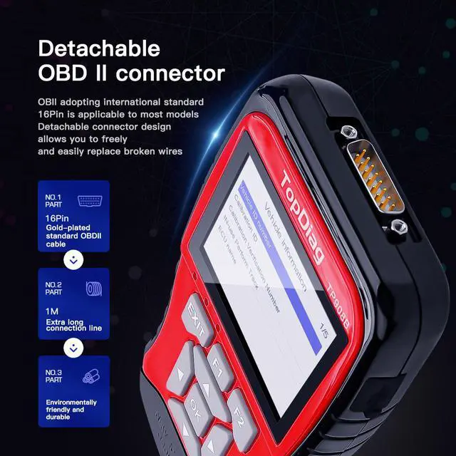EOBD features: 1. Support all 10 modes of engine diagnosis2. Suitable for most 1996 and newer vehicles (OBD II and CAN) -domestic and imported. 3. Built-in one-key I / M preparation function, can quickly carry out state emission preparation inspection and driving cycle verification.