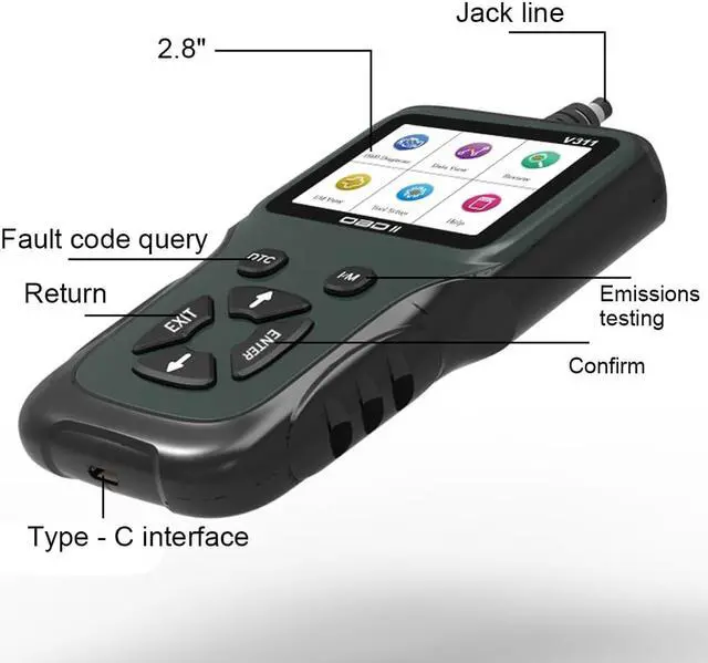 Material: plasticsConnect using type-C interface. Standard 9 protocols. 2.8 -inch color display, high resolution. The reliability is good, the power supplyed voltage ranging is 8-36V, with strong overcurrent and overvoltage protections functions. Real time data stream can be displayed. Perfect grip feelings, comfortable and convenient. New UI experience. High stability, fine quality, high speed. Support Chinese, English, French, German four languages, widely used. The car can easily determine the cause of checking the engine lights.