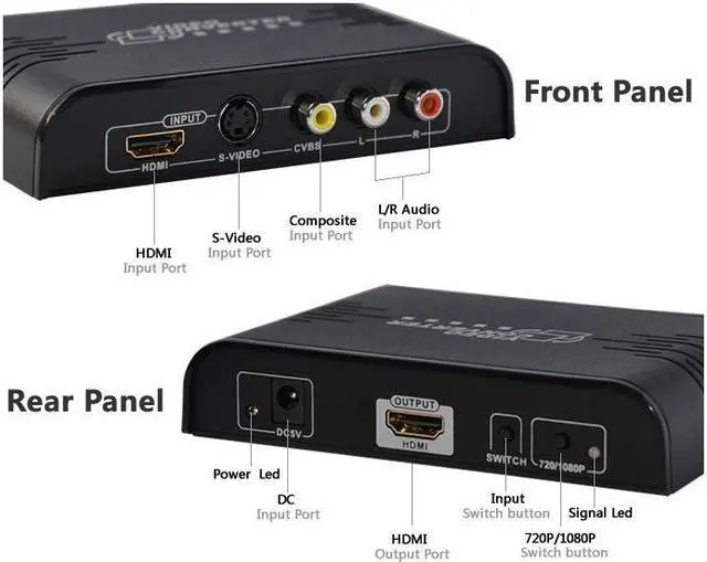 Features: 1. Convert analog audio and video signals into a single HDMI output for use with HD displays2. Up-scales Composite Video or S-Video up to full HD 1080p; 3. HDMI output is optional at 720P 50Hz/60Hz (LED: red )or 1080P 50Hz/60Hz; (LED: Green)4. Composite Video, HDMI and S-video can stay simultaneous connection, and to be selected as the input source by the switch button5. Composite Vide and S-Video Share the same audio input6. Supports OSD (One Screen Display)