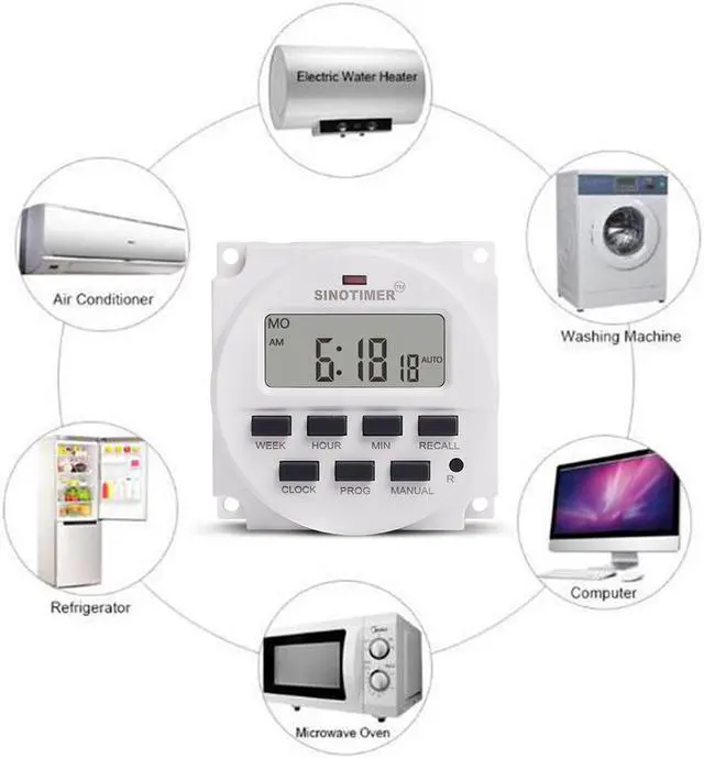 Features: 1. You can use the timer to switch ON/OFF any electrical equipments at a preset timer. 2. 16 ON/OFF programs per day, 15 combinations to a week. 3. 24 hours / 7 days a week programmable. 4. Built-in battery for backup the memory (save the programs you set) when power failure. 5. Automatic time error correction +/- 30 sec, weekly. 6. Repeat programs with 16 on/off settings, and setting on/off manually. 7. Easy to read LCD display, LED indicators. 8. Countdown OFF time range 1 minute to 24 hours. 9. It is suitable for water heater applications, panel mounting, wall switch applications, lighting control, outdoor switch applications.