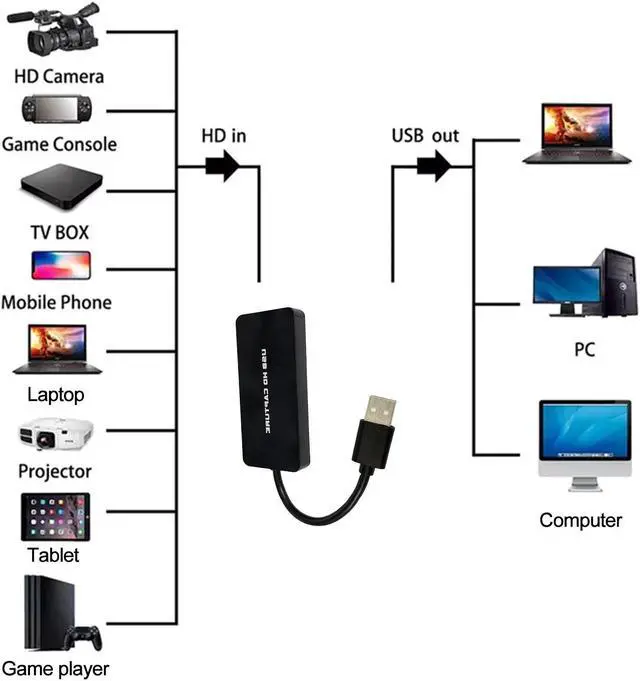 • Features:HD Video Capture, Supports input max resolution 4k 30fps, output 1080P 60fps. Superb quality keeps your streaming and recording more professional.Easy to use, No driver required, easily connect your DSLR, camcorder, and other devices with HD port to your PC for game recording, without external power supply, compact and portable.HD to USB 2.0 adapter is so small in size that easy to carry, does not occupy space.The HD Video capture card can capture video and audio simultaneously and transmit audio and video signals to computers for preview and storage.Suitable for HD acquisition, teaching recording, game capture, live stream, medical imaging, online meetings, etc.