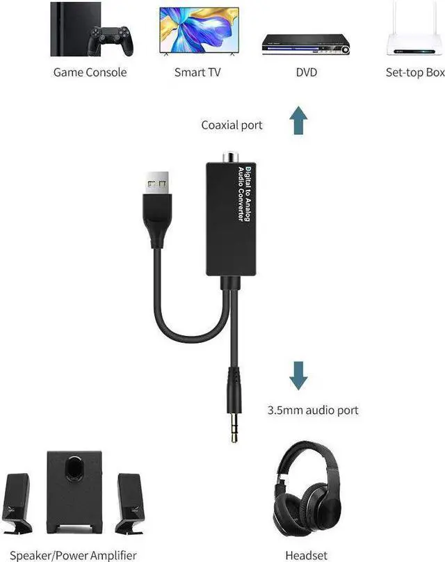 Features: Coaxial audio port supports game console, smart TV, DVD, set-top box, 3.5 mm audio ports supports speaker, power amplifier and wired headset. No noise, no distortion, fast and stable signal transmission, HiFi nondestructive sound quality. Soft PVC cable, wear-resistent, not easy to bend. Built-in intelligent chip, clearer sound. Plug and play, no driver required.