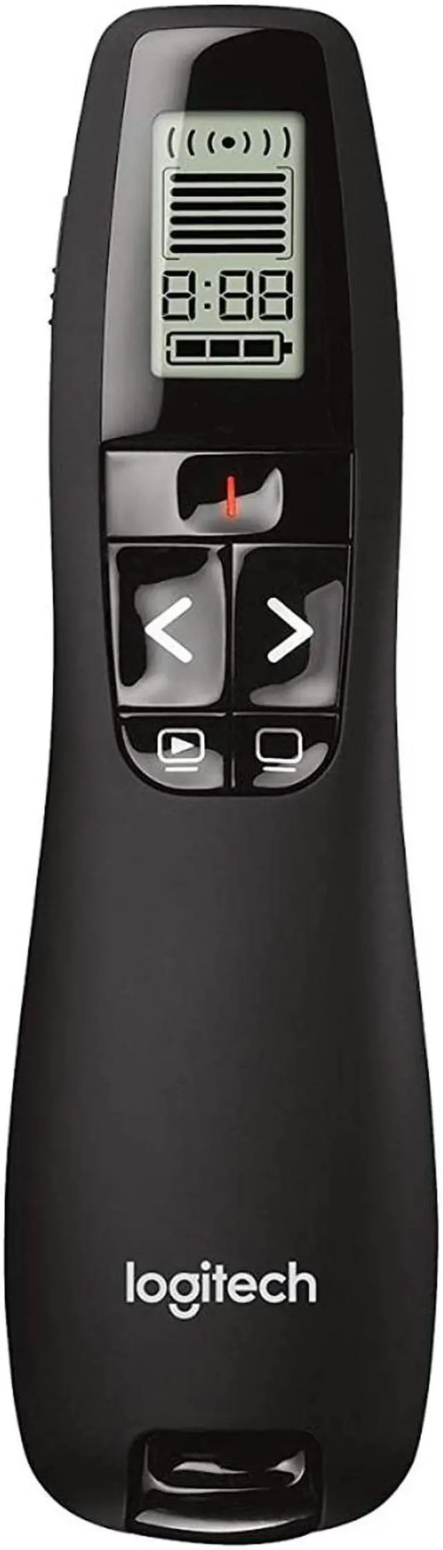 Logitech professional Presenter R800 gives you powerful control for high-impact presentations. The brilliant Green laser pointer is easy to see, even on flat panel displays, projection screens, and in brightly lit rooms. Manage your time with silent, vibrating alerts and controls that are easy to set and adjust. Move about For greater impact, with a range of up to 100 feet (30 meters) you can cover every corner of the room. Navigate through your presentation with Confidence thanks to intuitive slideshow controls you can find easily by touch. A storable plug-and-play wireless receiver makes it simple to get started—there’s no software to install. And when youre through, the receiver stores inside the presenter to make packing up Easy.