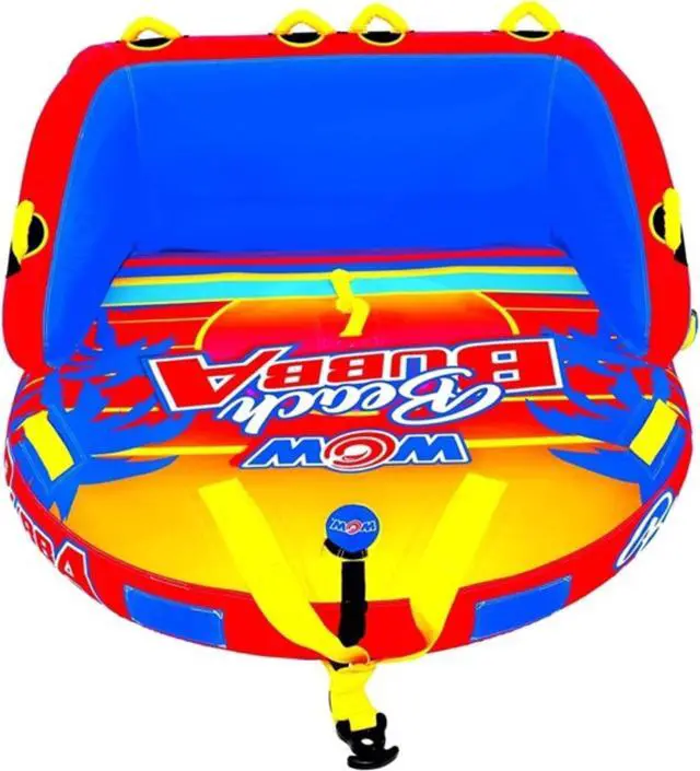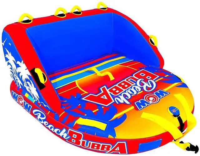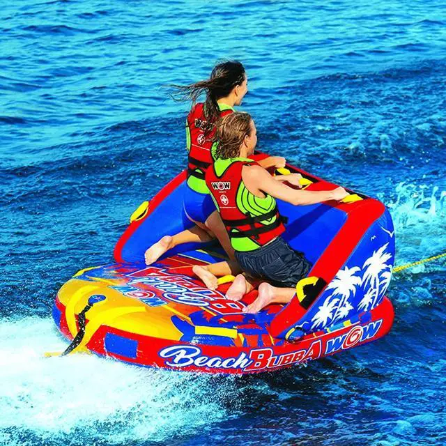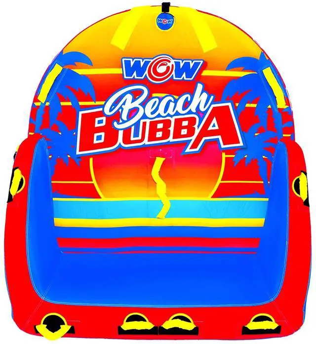 Lean on back and enjoy the ride with the two-person Beach Bubba. The extra high backrest and sidewalls make everyone feel secure and comfy on the water during extra fast, bouncy rides. Ride your way: standing chariot style, kneeling chariot, or even laying down! The double webbing foam handles will help you hold on tight no matter what you choose. The Beach Bubba has a smooth, comfortable surface all over, for a comfortable ride. We also enhanced it with some HI-VIS graphics that won't rub or chip off, so it stays looking stellar summer after summer. Includes a one-year warranty.