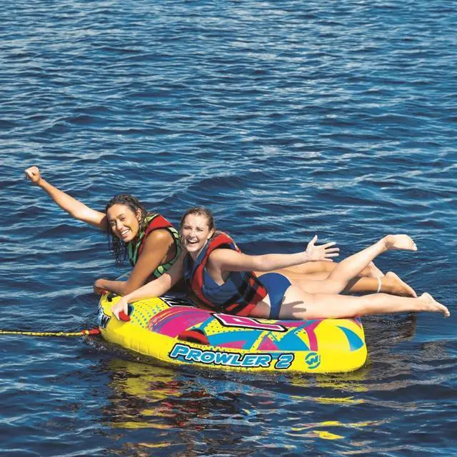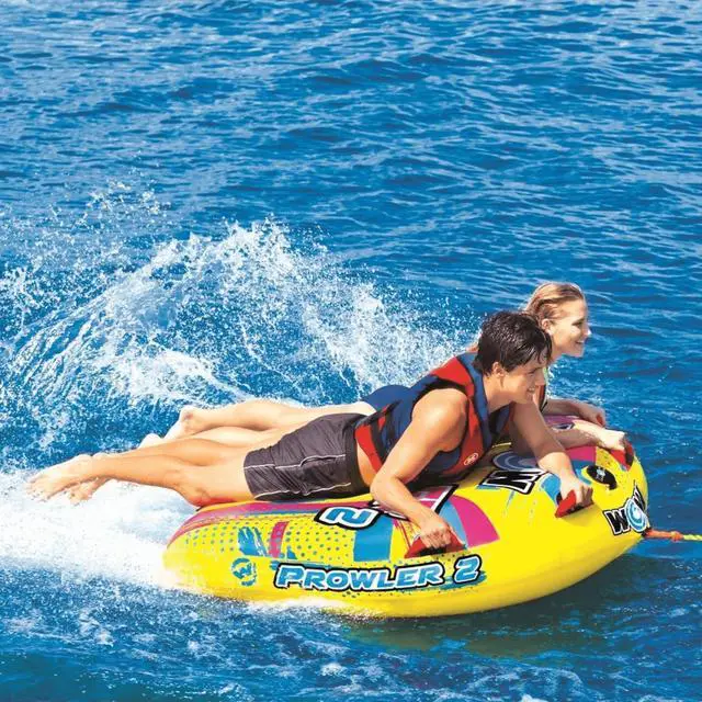 Not even the coolest cats and kittens will land on their feet when thrown from the Prowler 2. Hitch it up for a wild ride, take a waterside cat-nap or bring it on your next floating excursion. This kitty has everything you need for the prowl: the D-shaped towable, 12v pump for inflation, and 1 rope. The Prowler also inflates in no time, so you can get on the water sooner. It also deflates fast when you're ready to call it a day and head home.