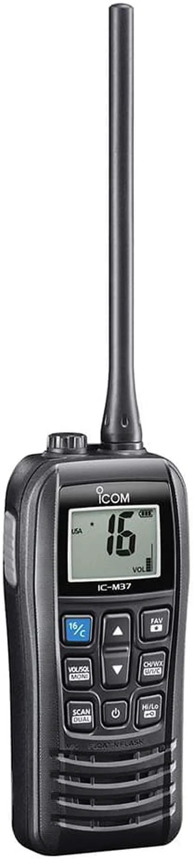Watt FloatingModel: M37 31 USAFloat’ n Flash function700mW audio outputLow battery alert functionDual/Tri-Watch functionInstant access to channel 16 and the Call channelWeather channels with weather alert functionDesigned for commercial and recreational boaters, the M37 comes with 6 watts of power for further communications range. The M37 includes all the great features in the M36, plus Icom’ s exclusive Float’ n Flash and a larger capacity standard battery. The M37 is the perfect size and has an easy-to-grip design with large keys. A bigger LCD screen shows large channel numbers and status icons for easy readability. Icom is proud to include the channel history function in an entry level marine handheld. This feature stores the last five channels used for easy recall at the press of a single button. SpecificationsFrequency RangeTx 156.025 — 157.425 MHzRx 156.050 — 163.275 MHzUsable channelsINT, USA, CAN, WX channelsCurrent drain (at 7.4V DC) Tx ( 6.0 W/ 1.0 W output) 2.75 A/ 1.0 A Rx (Max. audio. Inter SP/Exter SP) 0.4 A/ 0.2 AOperating temperature range-20° C to +60° C; -4° F to +140° FAntenna Impedance50? (Projections not included) 2.4 5.5 1.5 in (with BP-296)Weight (approx.