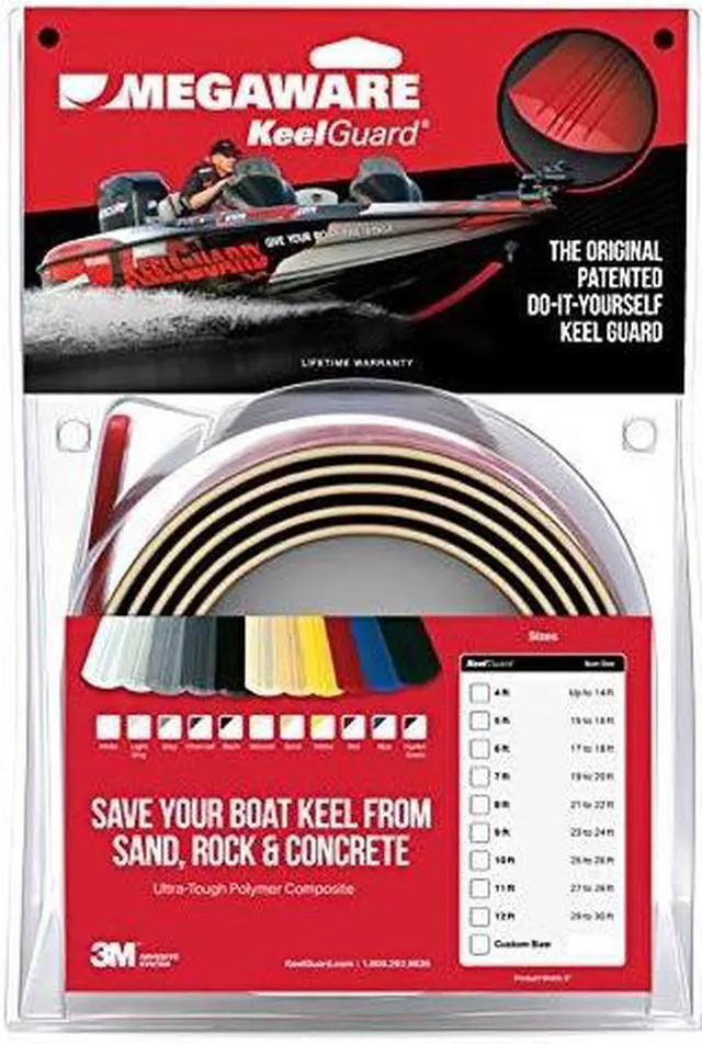 A pressure-sensitive adhesive creates strength, while permanently bonding and sealing Megaware KeelGuards contoured edges to the hull surface. Angled grooves produce hydrodynamic channels, creating air pockets and providing a slicker surface. The perfect combination of these factors makes the Megaware KeelGuard the easiest keel protector to install, and gives it unparalleled quality and dependability. Megaware KeelGuard Colors SizesMegaware KeelGuard comes in 11 great looking colors to match virtually any boat. All colors are UV-stabilized for true color that lasts a lifetime. Megaware KeelGuard is available in nine standard lengths or can be ordered in custom lengths.