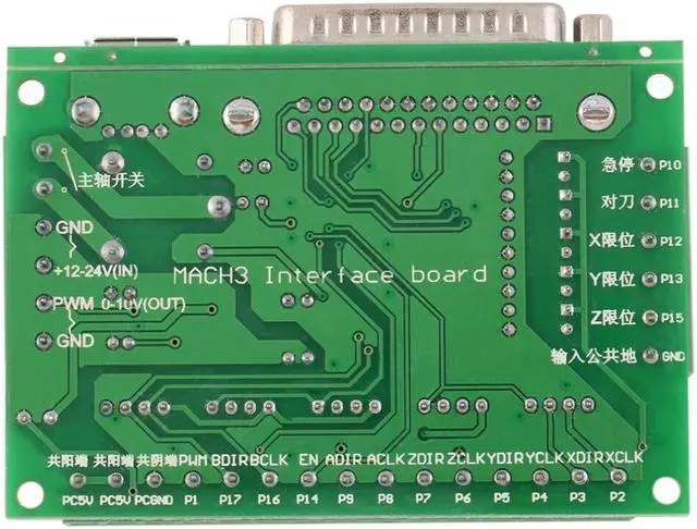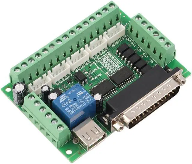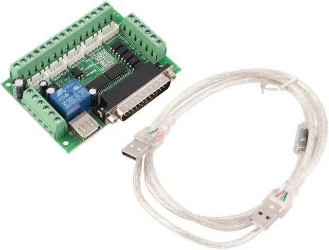 Upgraded 5 Axis CNC Interface Adapter Breakout Board For Stepper Motor Driver Mach3 +USB CableProduct Description: Features: 1.100% Brand new and high quality. 2.Fully support for MACH3 and other computer software support for parallel port control. 3.USB power support and peripherals powered phase separation to protect computer secrity. 4.all of the input signal, all the light lotus isolated, which can be accessed emergency stop on the knife, the limit to protect computer security. 5.all the way through the optocoupler isolated 0-10V analog voltage output can be controlled with the corresponding analog interface converter to control the spindle speed. Output port P1 port. 6. all the way to the relay output port, control spindle switch. Output port P17 mouth. 7. Open all 17 ports, which can be controlled with optocoupler input spindle governor. 8. Peripheral wide voltage input,12-24V, and anti-reverse function. 9.can be accessed by a common cathode or common anode input level to 5V drive Specifications: Board size: 90*70*18mm Board Color: Green Optical Coupler length: 135cm