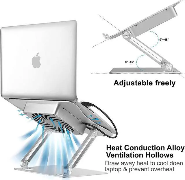Cooling Better The office computer stand is totally made of thickened Aluminum alloy, it can absorb and discharge heat easily. It also has holes and a cooling FAN on the surface which can cool down your laptop BETTER.