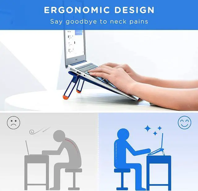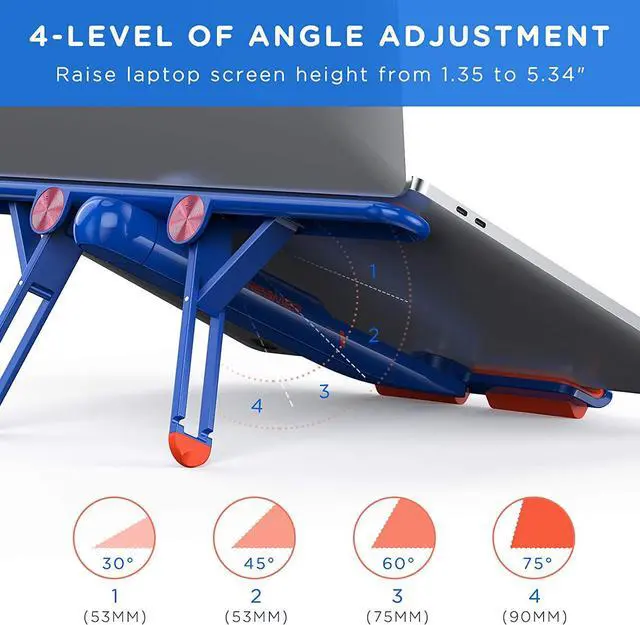 Adjustable and SturdyThe laptop stand provides 4-speed adjustable height, adjust to suitable operating angle and height based on your need. Very comfortable for studying and working in home, office, and outdoor. It is made of special plastic and high-quality aluminum alloy materials, with a firm triangle support design, durable hinge, which makes it sturdy, supports up to 44 lbs(20 kg).