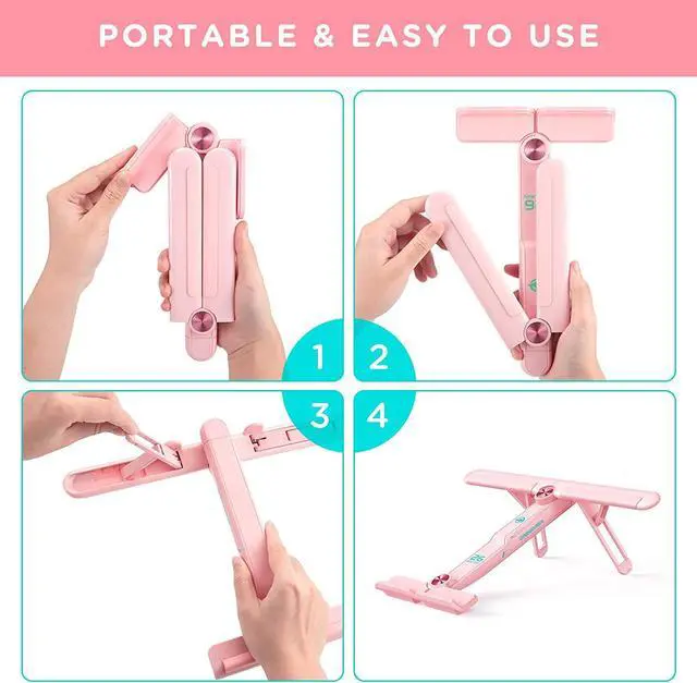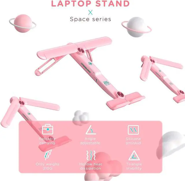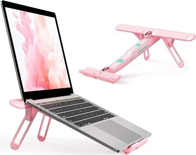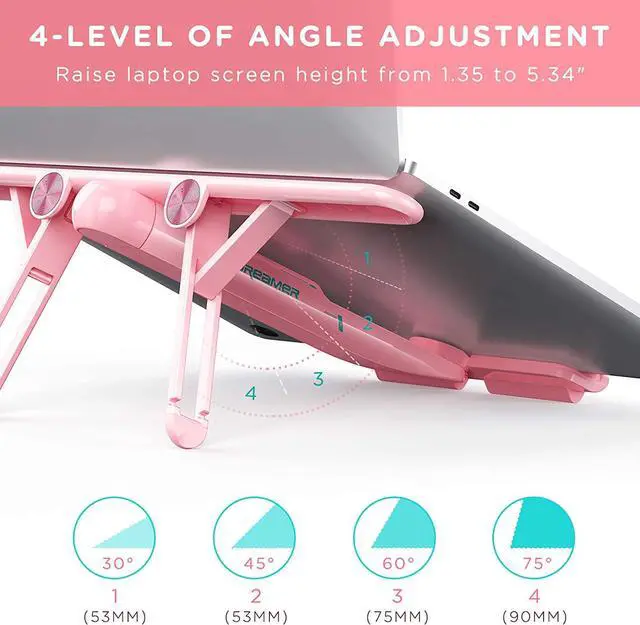 Adjustable and SturdyThe laptop stand provides 4-speed adjustable height, adjust to suitable operating angle and height based on your need. Very comfortable for studying and working in home, office, and outdoor. It is made of special plastic and high-quality aluminum alloy materials, with a firm triangle support design, durable hinge, which makes it sturdy, supports up to 44 lbs(20 kg).
