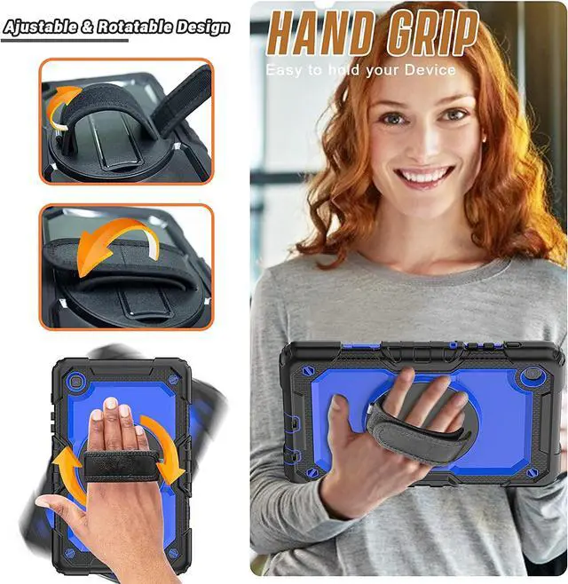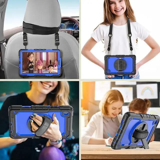 ?Adjustable Shoulder Strap + Hand StrapAdjustable shoulder grip can be slanted and release your hands completely.This function is used for traveling, restaurant ordering, home product introduction, engineer outdoor operation, teacher, etc. and even hang it on your car seat.Also, strap allows to hang up your tablet behind car seat for entertainment for kids.