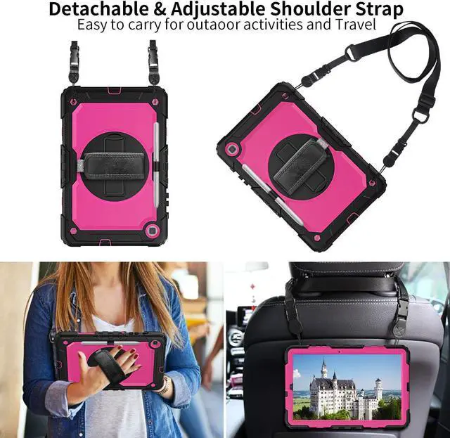 Adjustable Shoulder StrapAdjustable shoulder grip can be slanted and release your hands completely. This function is perfect for traveling, restaurant ordering, home product introduction, engineer outdoor operation, teacher, etc. Also, the strap allows you to hang up your tablet behind car seat for entertainment for kids.
