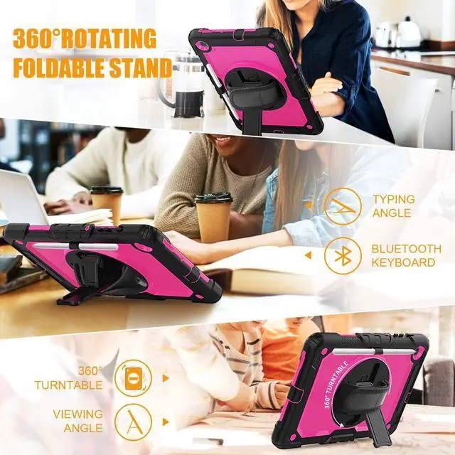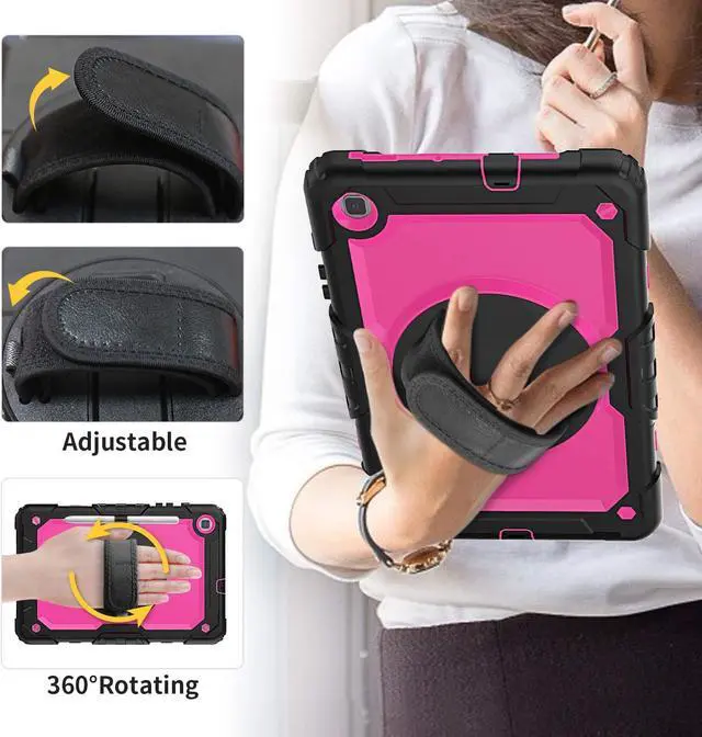 Built-in 360 Rotatable Kickstand + Hand Strap360-degree rotating swivel stand supports position of 3 angles(Vertical, Horizontal, and Halfway between), ideal for watching videos, conferences and travelling. Soft rotating handle strap prevents falling of samsung galaxy s6 lite tablet, featuring convenient use for teachers, students, waiters, doctors, nurses and conference presenters.