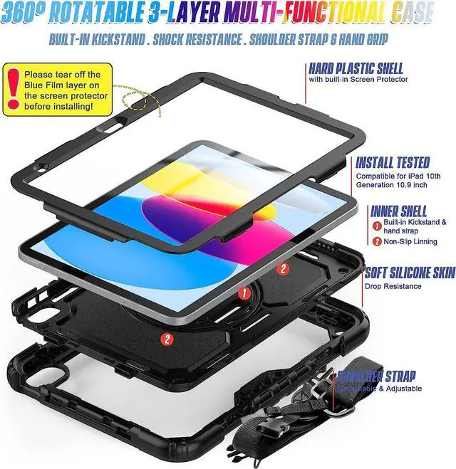 ?Built-in 360 Rotatable Kickstand + Hand Strap360-degree rotating swivel stand supports position of 3 angles(Vertical, Horizontal, and Halfway between), ideal for watching videos, conferences and travelling. Soft rotating handle strap prevents falling of iPad Generation 10th tablet, featuring convenient use for teachers, students, waiters, doctors, nurses and conference presenters.