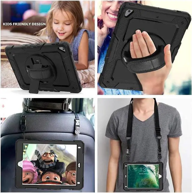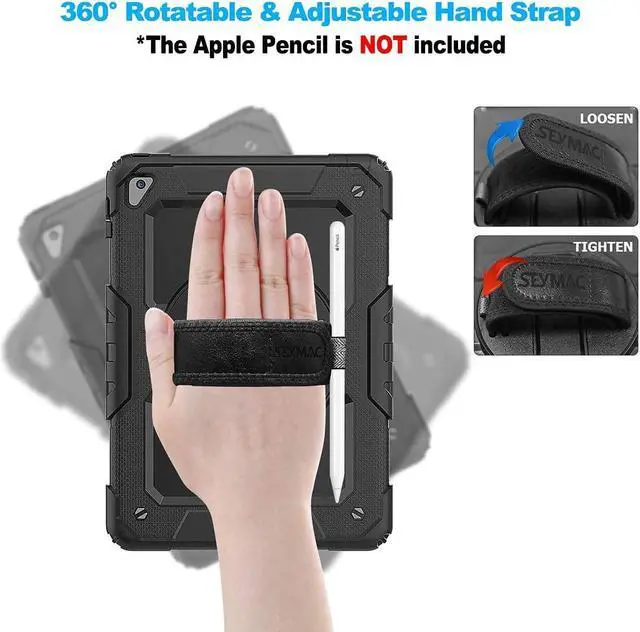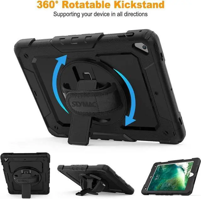 ?Built-in 360 Rotatable Kickstand + Hand Strap360-degree rotating swivel stand supports position of 3 angles(Vertical, Horizontal, and Halfway between), ideal for watching videos, conferences and travelling. Soft rotating handle strap prevents falling of iPad Air 2 tablet, featuring convenient use for teachers, students, waiters, doctors, nurses and conference presenters.