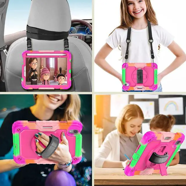 ?Adjustable Shoulder Strap + Hand StrapAdjustable shoulder grip can be slanted and release your hands completely.This function is used for traveling, restaurant ordering, home product introduction, engineer outdoor operation, teacher, etc. and even hang it on your car seat.Also, strap allows to hang up your tablet behind car seat for entertainment for kids.