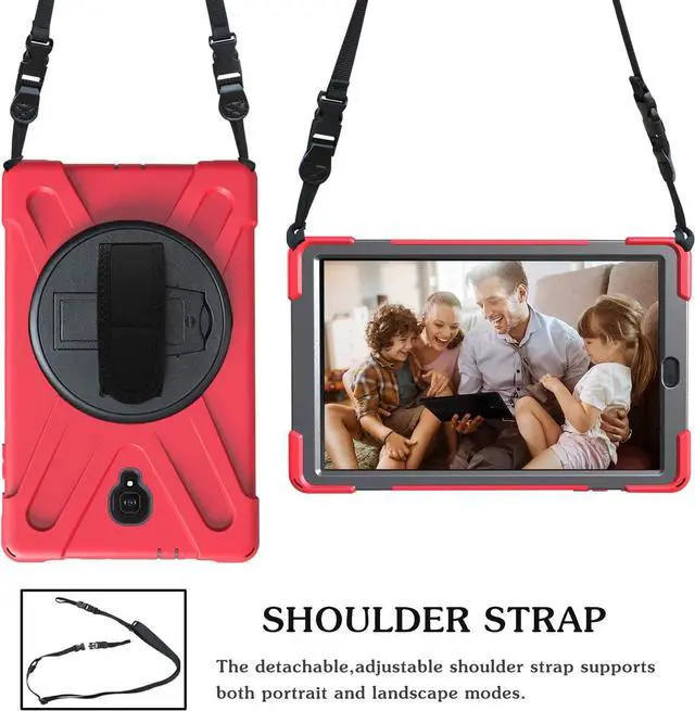 INTEGRATED PALMSTRAP,KICKSTAND AND INCLUDES SHOULDER STRAP: The shield case for samsung galaxy tab a t590 cover comes with all the features you need as you use your tablet daily. The built-in kickstand (which flips out in the back of the cover) allows you to watch your favorite shows. The palmstrap allows you to have a more secured grip on your tablet. It's best feature is the shoulder strap as it allows you to carry your device easily which is a very needed feature in todays lifestyle.