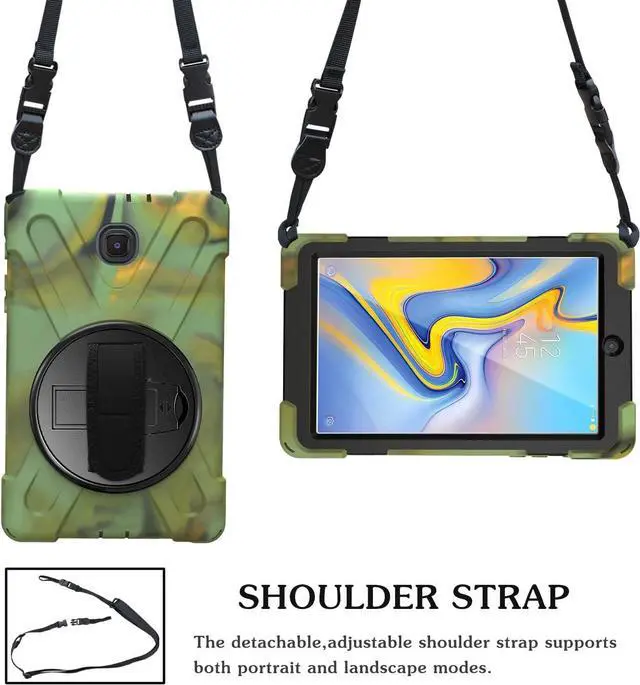 Integrated palmstrap, kickstand, & includes shoulder strap - The shield case for samsung galaxy tab a t387 cover comes with all the features you need as you use your tablet daily. The built-in kickstand (which flips out in the back of the cover) allows you to watch your favorite shows. The palmstrap allows you to have a more secured grip on your tablet. It's best feature is the shoulder strap as it allows you to carry your device easily which is a very needed feature in todays lifestyle.