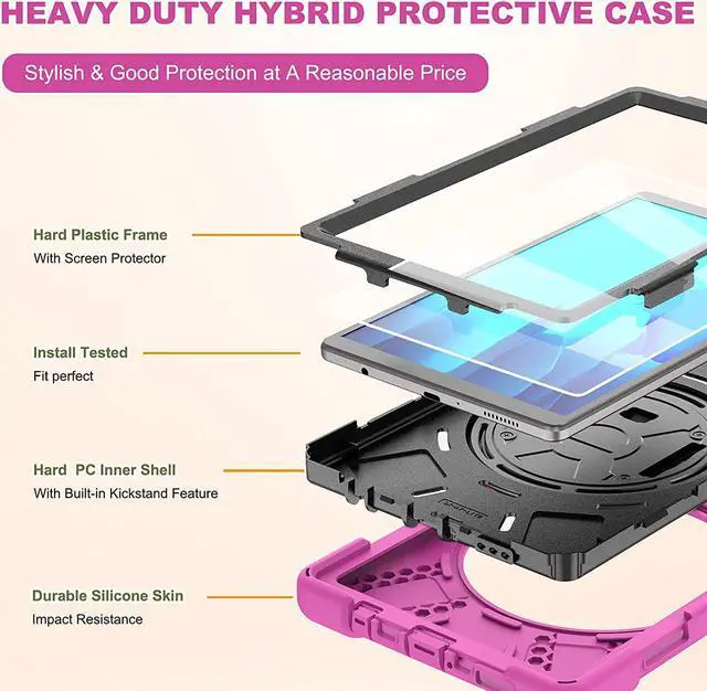 Made with high quality materials. The interior is made with heavy duty poly-carbonate plastic that is a snug fit encapsulating your device securely. It is a two-piece (front and back) rugged shell to protect your tablet. It's exterior is made with soft silicone rubber gel that wraps around the hard plastic inner layer for an added protection and comfortable grip. It is a shockproof drop protection absorbing case.