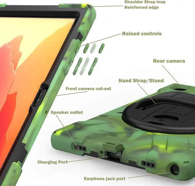 Easily Charge/Sync, Stand & Carry - For your convenience, this cover have cut-outs giving you access to your tablets charging port & earphone jack making this case easy to use and very convenient. Built-in kickstand that flips out and rotates giving you multiple viewing options so you can comfortably use your tablet device allowing you to enjoy, play, and have fun. Includes a removable shoulder-strap so you can carry your Samsung Galaxy Tab A7 10.4 smt500/smt505