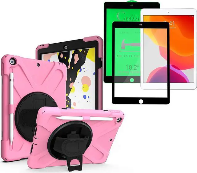 Shockproof Case Full-Body Heavy Duty Cover Stand with Shatterproof Ceramic Screen Protector for Apple iPad 10.2 7th 8th Gen (Light Pink)