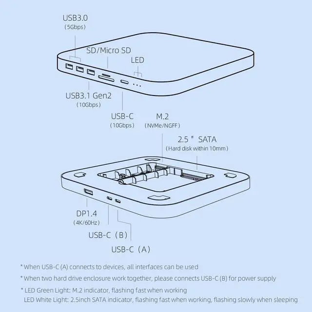 Dual Hard Drive Enclosure Design: Compatible with M.2 (NVMe / NGFF) and 2.5inch (Mechanical / Solid State) hard disk (Hard disk within 10mm), support dual hard disk read and write at the same time